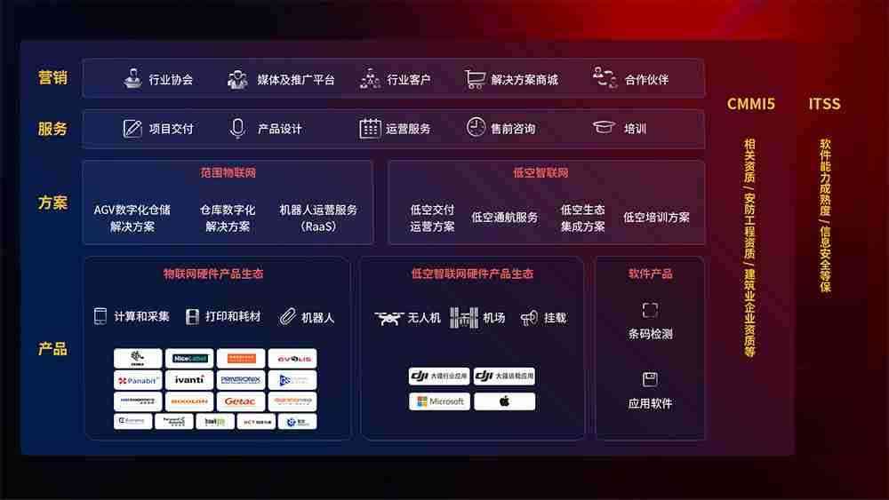 聚合国内外先进的物联网硬件产品品牌,,,聚焦数字化仓储、、、机器人运营、、、、低空智联网等领域,,,共同打造适合客户业务场景的解决方案并提供交付服务
