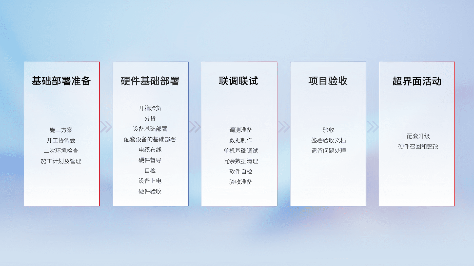 从基础部署准备、、、硬件基础部署、、、联调联试、、、项目验收、、、越界面活动的全过程可追溯,,,保证施工质量和进度。。。
